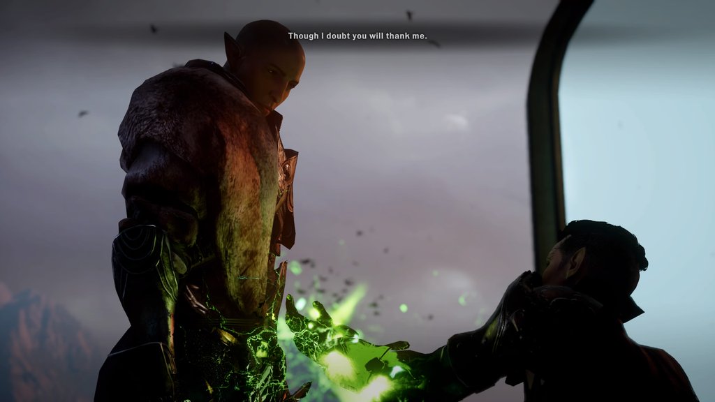 It seems he wants to tell me what he did no matter what I want, so he spouts on and on. Apparently he created the veil after freeing Elven slaves. In creating the veil he destroyed Arlathan, the ancient Elven world lost to us. Solas tells me he deeply regrets his actions, that he can restore the Elven people even if it means destroying the world as we know it. Sorry, what? Not only did you create the veil, or so you think, but you’re the reason our people are suffering? Nothing you can do will fix this. Nothing. You messed up before and you’ll no doubt mess up again, and in that moment I vow to stop him. Solas tells me I can try, but I need to focus on the Inquisition for now. The Qun have failed in their mission thanks to him (hey, fucker, I helped) and will likely retreat to focus on Tevinter for a few years. Thanks for the heads up, Solas. Like that’s not an obvious piece of intelligence. Even Leliana could suss that one out, and her spies are the laziest around.