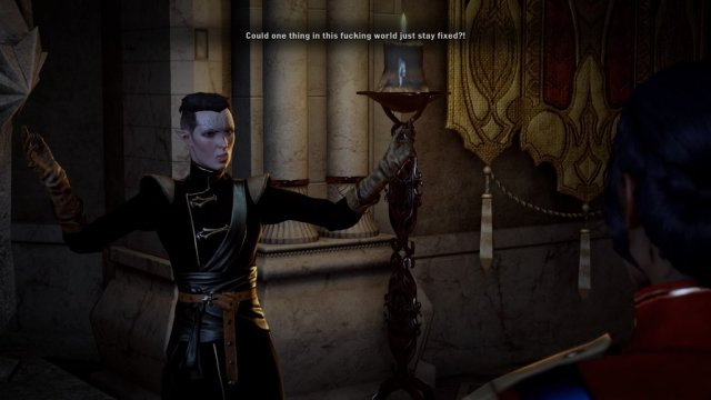 I tell her we still stop the Agent of Fen’Harel if that’s what she wants. If that’s what will stop all of this. She laughs again and I am this close to throwing a hex at her face. She doesn’t understand how I can defeat the Agent of Fen’Harel when he is the one who has helped me defeat Corypheus. When we’re allies. What? Who the hell is she talking about? The Viddasala reveals it is Solas who is the Agent of Fen’Harel. Fucking Solas. Vivienne laughs. She’s not one bit surprised. Neither am I, to tell the truth. It explains why he disappeared.