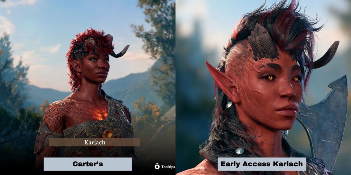 The earliest images of Karlach—what we’ll call EA Karlach for Early Access—showed her with clearly “Black” physical features. There’s no one way to “look” Black obviously, but there are common markers. EA Karlach had bigger lips and a wide set nose nearly identical to the facial model of the Tielfing Cyrus—another refugee from Avernus. Developers styled her hair (locs, associated with Black hair textures) into a faux hawk players could use on their Tavs.