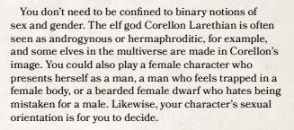 Of course, it’s not perfect: while the actual text of the paragraph uses the correct distinction between sex and gender, the fact that only “sex” is listed as the header might give readers the wrong initial impression about which terminology to use when. (Although you might argue that this is a good thing, because it’ll inadvertently attract the type of people who immediately think “awww yeah gettin’ laid by hot elf NPCs” and then maybe those dweebs will learn something). And it’s not as if people weren’t allowed to play any type of gender they wanted before–after all, a game of Dungeons and Dragons can be as inclusive and accepting as the people who are getting together and playing it.