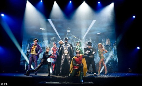 Because that big-budget, epic Spider-Man musical has been such a runaway success, DC Comics and Warner Brothers thought to create a Batman “arena theater” show that will premiere in Manchester, England and make its way to the United States next year after touring the UK. Featuring an original story focused on Dick Grayson, it has been described as “a theatrical extravaganza of thrilling stunts, acrobatic acts and illusions” and “neither a musical, nor a traditional theatrical production, but ‘an elaborate all-new, all-action arena production aimed at kids and families.'” It’s also being described (by /film) as “a direct continuation of the story that was unceremoniously dropped after Batman & Robin.” And we all know how well-received that was. Photos and a video after the jump so you can judge for yourself!