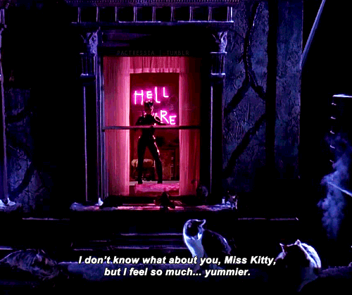 All jokes aside, Batman Returns‘ Selena Kyle/Catwoman is without a doubt the standout character of the film. She is the only one with a true character journey. Her mousy demeanor and subservient personality belie a very smart woman who is being tied down by people’s perception of who she is, and what a woman should be. Her mother’s answering machine message. Her apartment, which is painted a terribly garish shade of pink and filled with stuffed animals, shows us a woman who is stuck in the mentality of a girl. That’s when the cat gods step in.