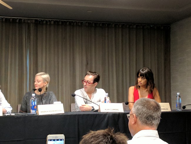 Alan Cumming, who plays Ted Tinling, an English tennis player/fashion designer who accompanies the Original Nine on their first circuit and becomes a confidante to King feigned indignance at the conference moderator calling his character “one of the girls,” (Cumming: “How dare you!”), but then talked about loving his time on set, because “It’s actually unusual to be surrounded by so many women on a film set. I liked it.”
