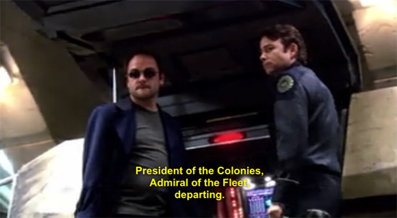 …because Baltar’s a self-serving asshole with a history of manipulating the system. And he wants to be a handed an official seat in the government? Really? All Baltar’s rhetoric about democracy and the people deserve a voice and we need a new way of thinking is just that: rhetoric. His devotees, as members of the fleet, already have a voice, same as all the non-cult members do. They’re not disenfranchised. This isn’t a theocracy. (Well with Roslin’s prophecies it kinda was, but whatever.) Baltar isn’t out for justice, he’s out for power, even if he’s managed to trick himself into believing otherwise.