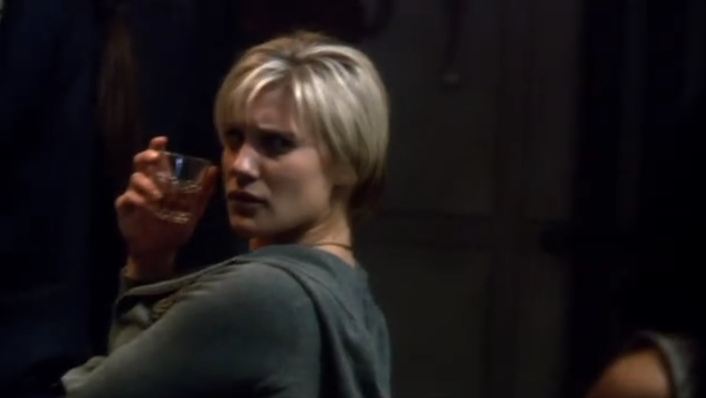 And now: I’ve put it off long enough. I have to talk about the Lee/Dee Starbuck/Anders stuff that went down this episode. Tyrol shows Lee a new bar that’s sprung up on the Galactica, and Lee starts spending a lot of time there, to the dismay of Dee, who… y’know, doesn’t like her husband coming home drunk all the time. She later calls him on his affair with Starbuck, and he says that there’s nothing going on, and that… oh Gods, it makes me see red just to type it… that “The only problem is that you don’t trust me.”