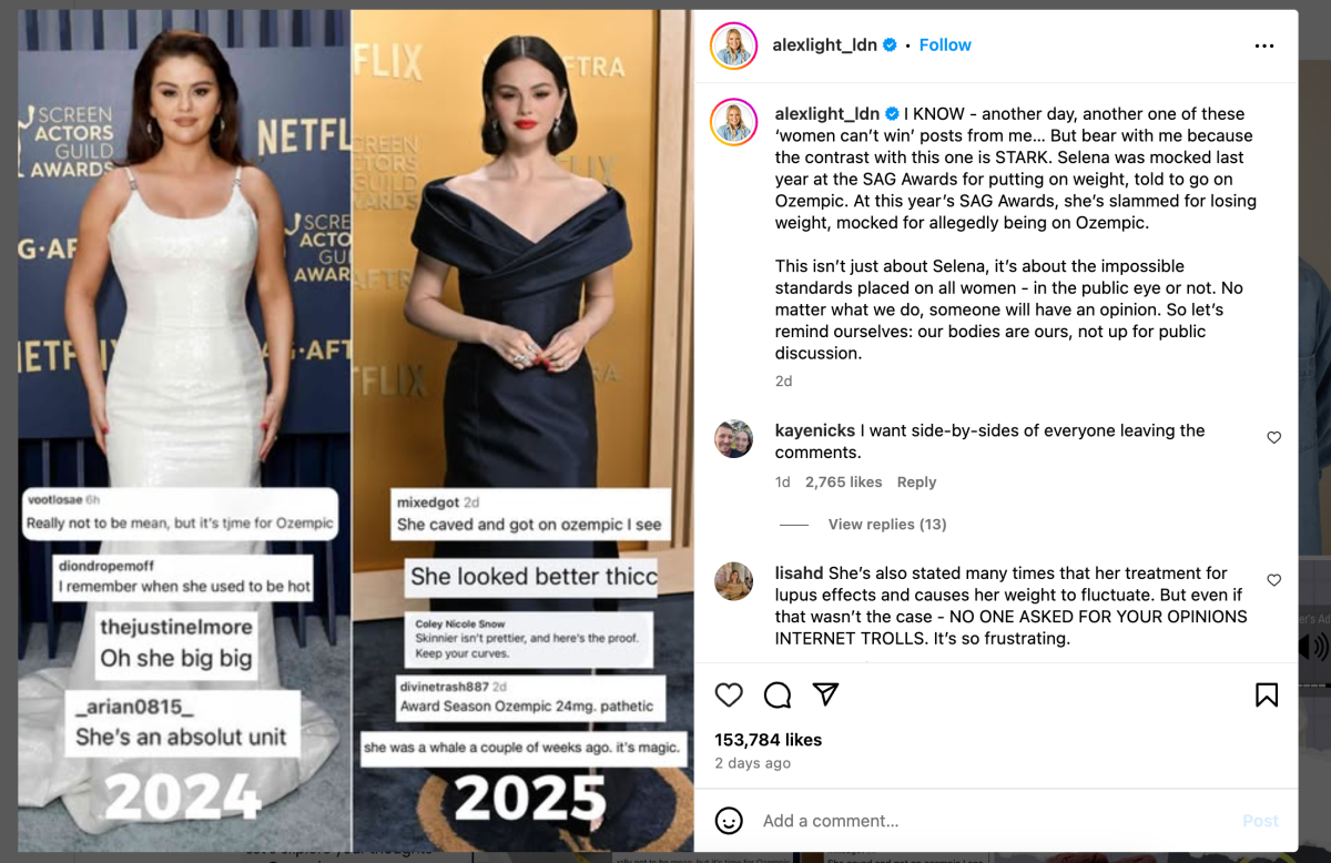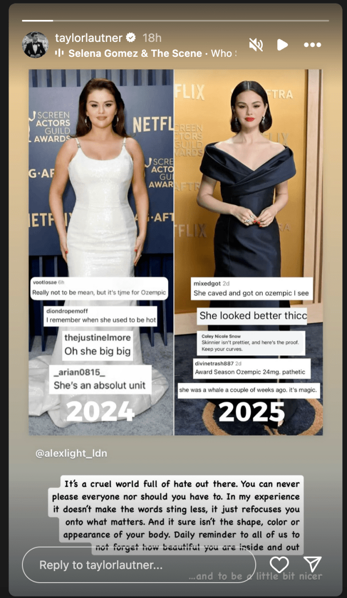 Shortly after the SAG Awards, influencer Alex Light and actor Taylor Lautner both spoke out to defend Gomez. Author and body confidence influencer Light shared an Instagram post comparing the comments Gomez received at the 2024 SAG Awards to those at the 2025 SAG Awards. Gomez looks absolutely stunning in both images. However, in 2024, she was fat-shamed by cruel internet trolls who were apparently triggered by the fact that her body wasn’t the same as it was when she was a child actor. In 2025, they were angered that Gomez appeared to have lost some weight, as they accused her of using Ozempic and complained that she looked better than before.