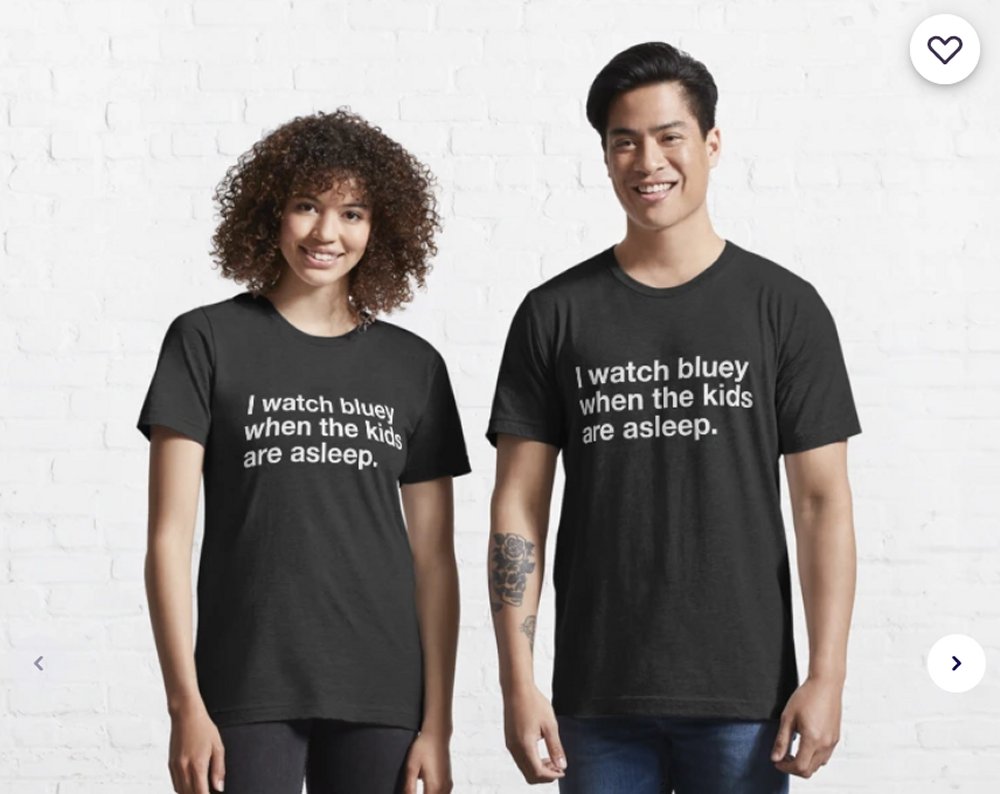There are countless adult fans of Bluey and they happily wear their love of the show for everyone to see. This shirt from Redbubble store Gumshoe-Studio declares, “I watch Bluey when the kids are asleep.” Which is of course nothing to be ashamed of! Some people watch Bluey without there being any kids in the picture at all!