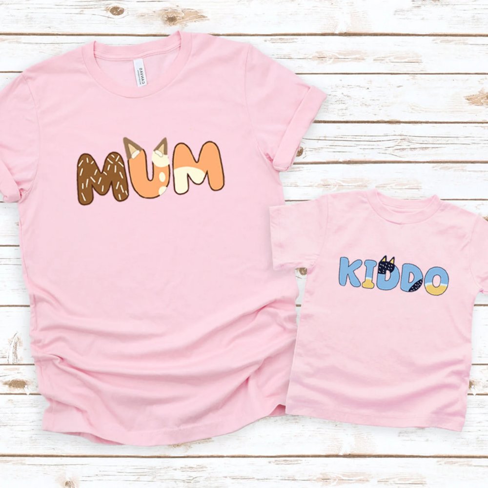 Share your love of Bluey with your child when you purchase this combo. Mom has a shirt saying “Mum” (per the Australian dialect) in the Bluey font, and the kiddo’s shirt says, well, “Kiddo”! No Bluey-loving family could ask for anything more.