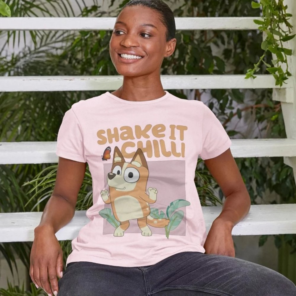 Chilli is Bluey and Bingo’s mom and a very good one. She also loves to dance! This shirt from the online Bluey store features a dancing Chilli with the words, “Shake it Chilli.” Like all t-shirts from the official Bluey shop, it’s made with renewable energy processes.