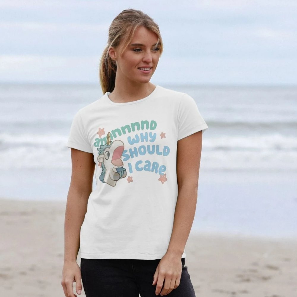 Remember Unicorse, the extremely annoying puppet voiced by Bluey herself? You know, the one who goes “Annnnnnd why should I care?” Well, you can celebrate the sheer obnoxiousness of that puppet with this shirt from the official Bluey store. It’s available in five colors: black, white, khaki, navy blue, and stone blue.