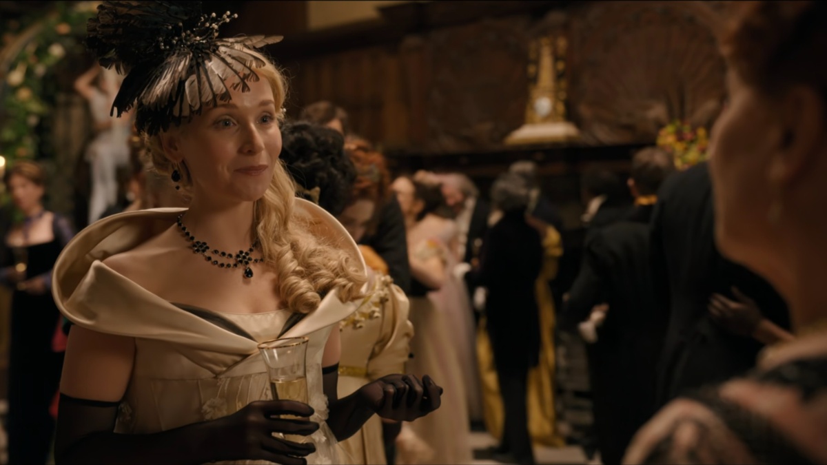 There’s nothing like a revenge dress and this is certainly that. Having had a little falling out with Simon, Daphne sets her eyes on a prince and arrives at a ball in a stunning white gown that features a tulle glitter bodice and overskirt, her hair delicately curled with small white feathers placed in a tiara formation and a white fan which she wields flirtatiously. It’s a deliberate showstopper, with Daphne placed atop the stairs upon entering the room with all eyes on her as she slowly makes her way down to the prince awaiting her at the bottom.