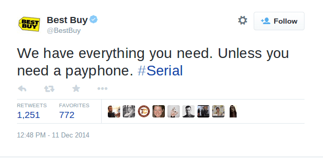 In a quest to determine if Syed was wrongfully convicted in the murder, Serial investigates loose ends in the case, one of which–a payphone a key witness claimed was available at the Best Buy in 1999–has become an obsession for fans, with amateur investigators flocking to the Maryland location. Although store spokesperson Jeff Shelman told The Huffington Post he couldn’t tell if Serial had boosted the Best Buy brand in general, Jeff Greenfield, the co-founder of media analytics firm 3C Metrics, disagrees: “Any mention of them, especially this time of year, is going to be to their advantage.”
