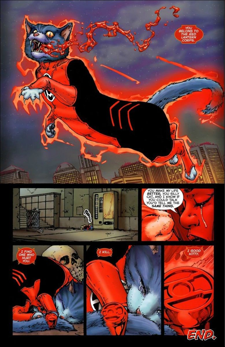 Another story about a ‘heroic’ (anti-heroic?) pet, this one being Dex-Starr the Red Lantern. Warning, this story does feature animal abuse, including the attempted drowning of a cat, but don’t worry, the cat bites back.