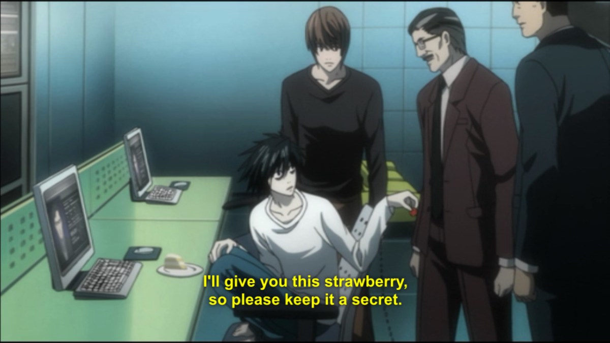 Death Note may be a horror thriller about a supernatural notebook that kills people, Shinigami, complicated characters, and other complexities. But it also features some tasty-looking cake slices. L (Alessandro Juliani) is the character who’s usually eating sweats. And one memorable dessert is his strawberry shortcake. Mmmm.