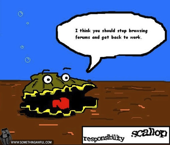 CAPTCHArt, or works of art MSPaint inspired by those squiggly CAPTCHA codes some websites make you type in to post or comment, is making a comeback lately since 4chan implemented it recently, but we’ve got to give Something Awful credit for pioneering the form. This is also the origin of Internet hero Responsibility Scallop.