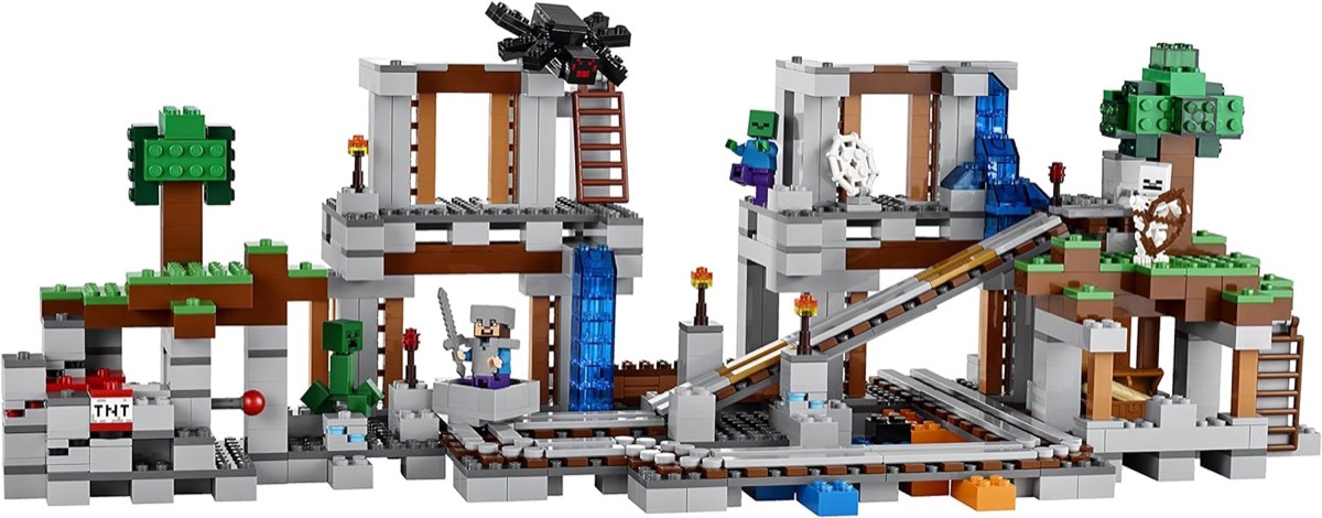 As for mobs? Don’t even get me started. It’s got a cave spider, wolf, baby wolf, two bats, Enderman, zombie, skeleton, slime, 2 small slimes, sheep and a charged Creeper. What else can you find in the mountain? Diamond, lapis lazuli, emerald, redstone, gold, and piles upon piles of coal. Equip your Steve or Alex miniatures with included golden armor, torches, and TNT and get spelunking! Worried about it getting dark in the mountain? Pieces of the set actually LIGHT UP. What’s cooler than luminescence? Without that, your little cousins wouldn’t even be able to see their TikTok videos. And what kind of world would that be? Pretty dark, if you ask me.