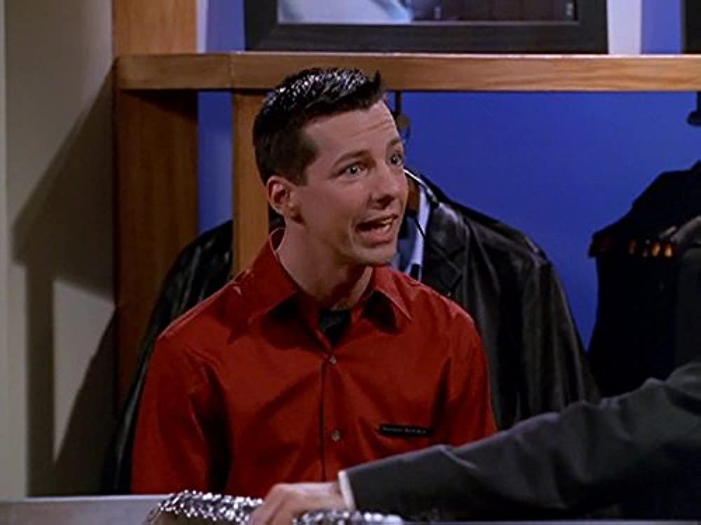 Jack McFarland wears a dark button up shirt