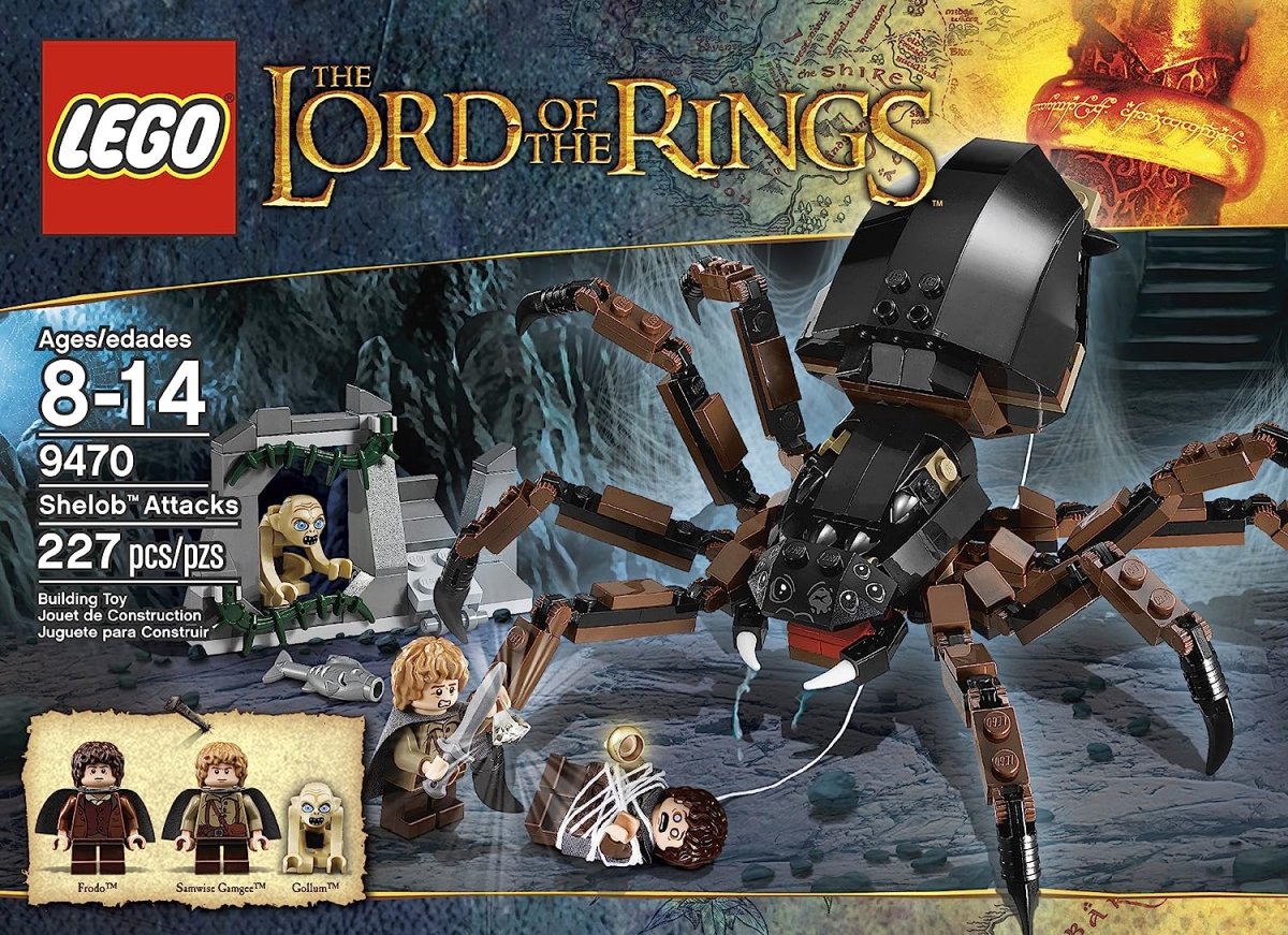Have a giant monster spider in kid-friendly Lego form! Shelob menaces Frodo and Sam in this set, just as she did in The Return of the King, while Gollum watches on. Oh, he’s got another fish! How nice for him. Frodo on the other hand just gets tied up with web, poor little Hobbit. The white web string that comes out of Shelob is a fantastic addition to this set. Watch out, though, I had some Lego string when I was a kid and I cannot overstate the amount of damage clumsy kids can do to a neat little feature like that.