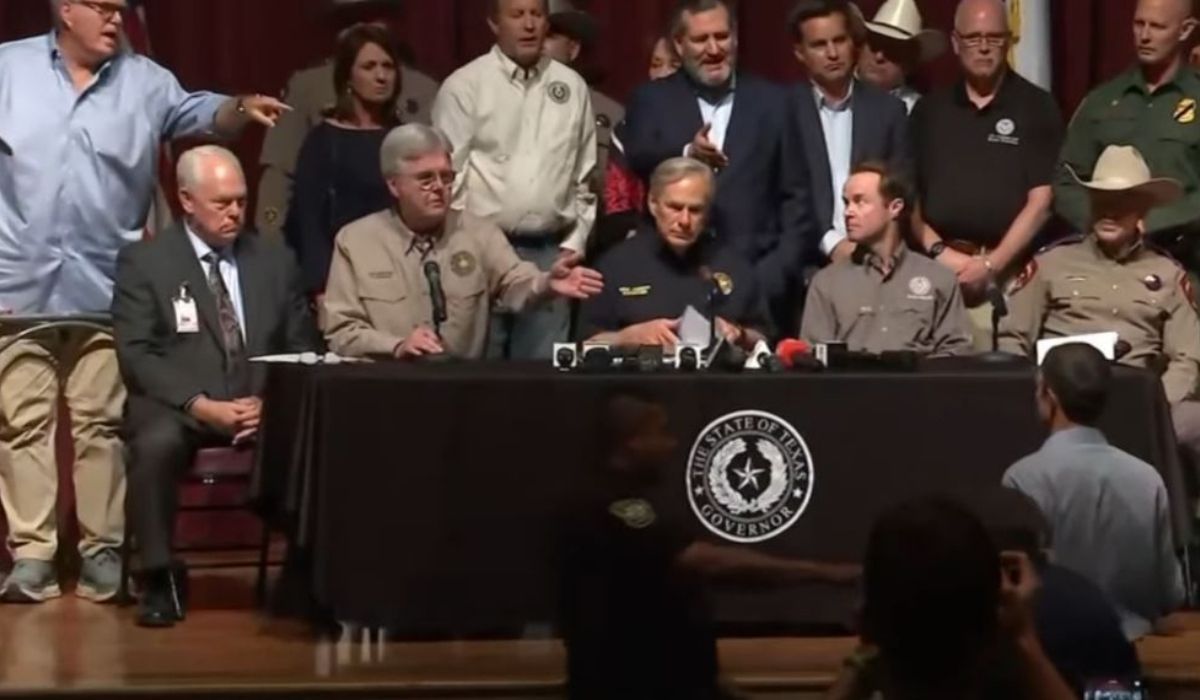 On video, as Abbott begins passing the mic to Patrick, you can hear O’Rourke, off-camera, saying something along the lines of “Governor Abbott, I would like to say something.” Everyone on the stage looks uncomfortable, Cruz starts chuckling, and McLaughlin starts yelling at O’Rourke. In the muffled chaos, you can hear O’Rourke reference the shooting at Santa Fe High School (2018, 10 killed) and El Paso (2019, 23 killed).