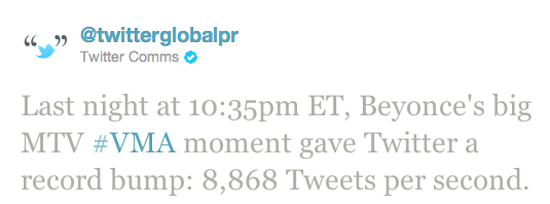 Whether or not you still watch MTV, a channel where one of those three letters stands for “music,” but didn’t play music videos so it had to launch a secondary channel in order to do so, they still have an award show for music videos, the Video Music Awards, something that seems worded a little backwards now that I just typed it. During the show the other day, at the end of a performance, Beyonce announced that she was pregnant. Sure, she might’ve used a hugely public media vehicle to announce something fairly personal to a bunch of strangers, and the last time a megastar did that, the world was not pleased with the ego required to do such a thing, but hey, we can’t help but care about celebrity baby bumps, as shown by the record-breaking 8,868 tweets per second traveling throughout Twitter after the announcement, knocking off the previous record holder, the 2011 Women’s World Cup Soccer Final’s 7,196 tweets per second.