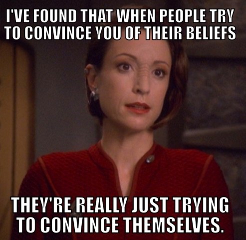 Deep Space Nine‘s entire premise was, in part, all about exploring whether or not Benjamin Sisko was The Emissary in the Bajoran religion, and while he was completely skeptical, the show itself didn’t shit all over religion. TNG’s Season 3 episode “Who Watches the Watchers,” while Picard gave strong voice to an anti-religion stance, the show’s characters generally treated the Mintakans and their beliefs with respect. Deanna Troi feeling everyone’s emotions? Technobabble? There’s plenty on Star Trek that was either spiritually-based, or was science that was so intensely made-up that may as well have been magic, because it was ridiculous! (I’m lookin’ at you, Magical Teleporter of Voyager)