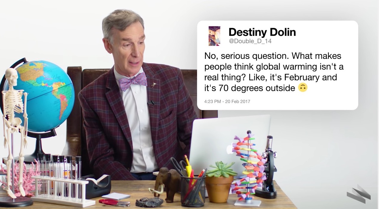 When asked about why climate change denial is still a thing, Bill Nye breaks down cognitive dissonance, and says, “People have a certain world view, they’re confronted with certain evidence that conflicts with that world view, so they have dissonance–conflict in their minds. So what’s generally done instead of changing your world view, which you might have held your entire life, you dismiss the evidence and along with that you dismiss the authorities that may have provided the evidence.”
