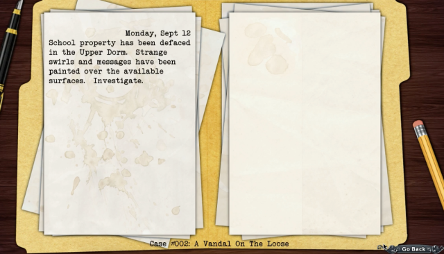 The case starts as the “Vandal on the Loose” on Monday September 12th. It reads, “School property has been defaced in the Upper Dorm. Strange swirls and messages have been painted over the available surfaces. Investigate.” My hunch before this started is to consult the art department if they are recently low on supplies of spray paint, but that option is not given here.