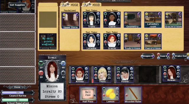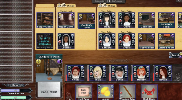 On the main game window, the tasks are assigned in chronological order as logs using a manila folder backdrop. The player can click the logs to track the progress of each respective task. New assignments start in the beginning of each week, and throughout the week as well. The dilemmas can stem from vandalism, missing items, suicidal students, violent students, missing students, stage anxiety, or even the assumption of having a problem. Ironically, when a player fails to discover that a situation presented in the log is non-existent (i.e. fake rumors) then it will still impact the council’s karma negatively. I give them points for this because circulating false information could lead to unwanted consequences especially if it pertains to politics.