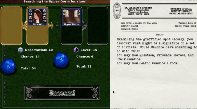 There is only one available clue I can click on and that is the “Upper Dorm” and the only way I can further reveal more clues is if I successfully find evidence that would hint at possible suspects or vicinities that needs investigation. Since Rowan has the highest observation and sneak skill, I choose her to stake out the upper dorm. On the bottom row of the game screen, there are 4 circle icons around Rowan’s portrait, blue, gray, green, and red that represent observation, stealth, social and intimidation respectively.