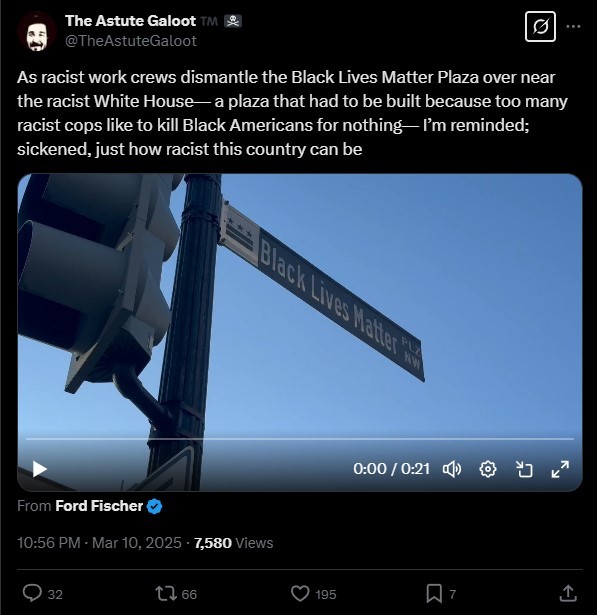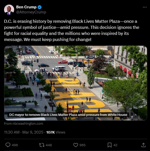 Civil Rights Lawyer Ben Crump wrote on X, “D.C. is erasing history by removing Black Lives Matter Plaza—once a powerful symbol of justice—amid pressure. This decision ignores the fight for racial equality and the millions who were inspired by its message.” He reminded us that the fight for social change was far from over and that society must keep pushing for it.