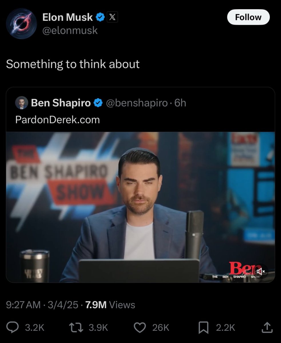 On March 5, Ben Shapiro posted that he believes that Derek Chauvin should be pardoned by Trump. Elon Musk retweeted this and said it was “something to think about.” Derek Chauvin is the cop convicted of George Floyd’s murder. Chauvin infamously pressed his knee on Floyd’s neck for more than nine minutes during an arrest. He was sentenced to 22 and a half years in prison.