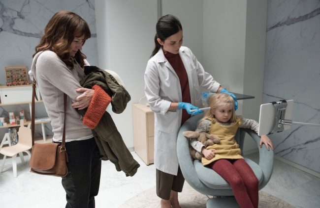 Directed by Jodie Foster and written by Charlie Brooker, the episode centers around a mother and daughter named Marie and Sara played by Rosemarie DeWitt and Brenna Harding. Marie implants Sara with a chip called Arkangel that allows her track and monitor her daughter. At a frightening turn of the episode, Marie sees her daughter having sex and learns that Sara is pregnant with the Arkangel technology. In response, she goes to the pharmacy, buys “emergency contraception”, and sneaks it into her daughter’s morning smoothie. After unknowingly taking EC, Sara pukes at school and the nurse tells her the emergency contraception she took to terminate her pregnancy made her sick.