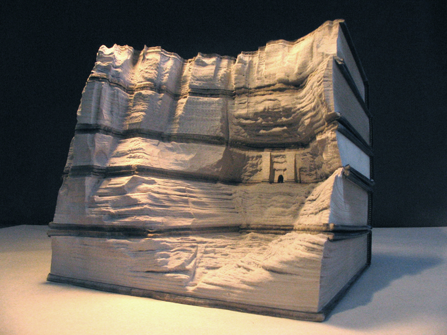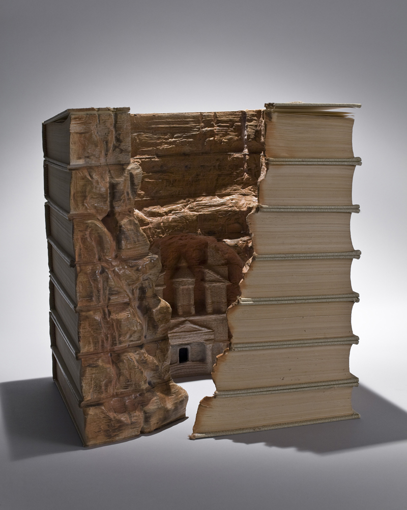 A better way to destroy a book than burning it, artist Guy Laramee makes extremely impressive sculptures out of books. Amplifying the impressiveness, Laramee not only sculpts the books, but tends to make one sculpture out of multiple books stacked or lined up together in one arrangement or another. Generally imitating some type of landscape, each piece is extremely detailed, and mighty impressive, not only showing off intricate terrain, but employing lighting effects from outside sources. Head beyond the break to check out more of Laramee’s unique book art.