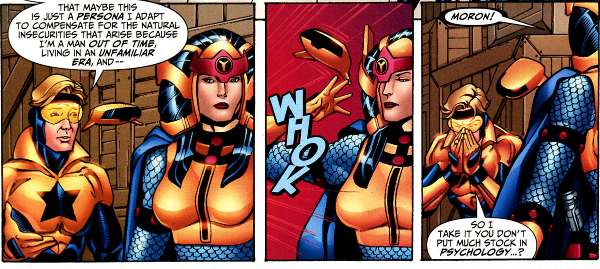 In other words, television, and our larger culture is absolutely ready for a show based on his character. Booster slowly realizes that being a superhero takes more than being telegenic, and his stories are a struggle between his natural inclinations towards attention whoring and the more noble inclinations that rub off on him as he brushes shoulders with the greatest historical heroes of his culture.
