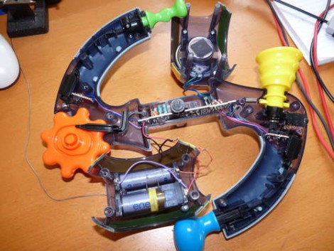 Clearly, the goal was to slow it down enough for his son to play, but the added bonus is that it can now be sped up for players on meth, or players with 4 hands. The other added bonus, as you might expect, is that speeding up or slowing down the Bop It also pitches the voice up or down. At super speed you play with a chipmunk, and at slower speeds you get to play with Satan. Hopefully it won’t give his son nightmares.