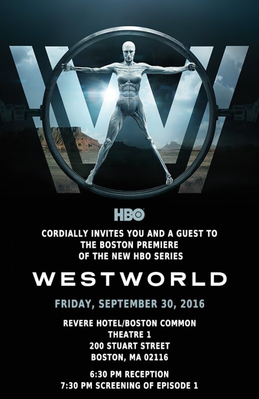 If you happen to live in Boston, like me, and you also happen to want to see the pilot episode of a sci-fi TV show starring Anthony Hopkins, Evan Rachel Wood, and James Marsden, and you also don’t have any plans tomorrow night, then you are in luck. The event will take place at the Revere Hotel near Boston Common; there’s a pre-screening reception at 6:30 PM, and the actual screening starts at 7:30 PM. RSVP to the event by filling out this form! If the live-tweeting urge strikes you, feel free to hit up @WestworldHBO and use the #WestworldBOS hashtag.