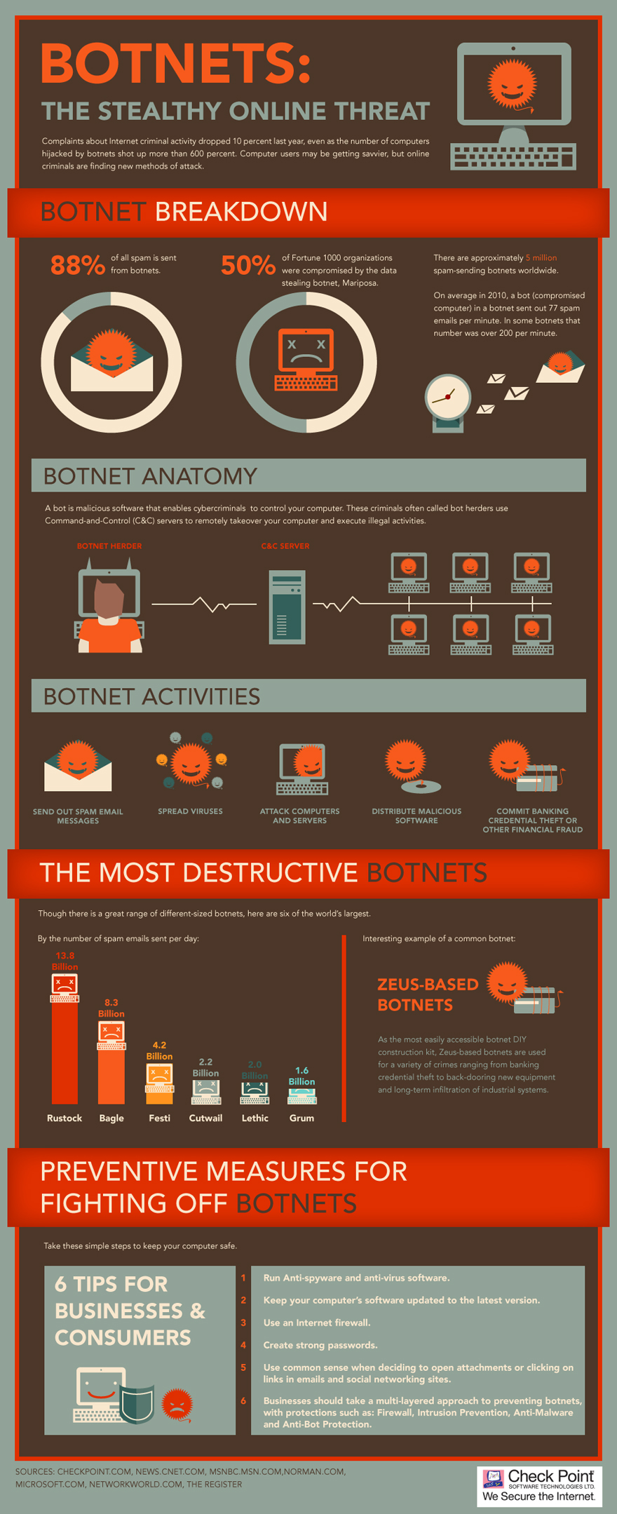 When it comes to cybersecurity threats, there are none that I find more terrifying than the botnet. We’ve written about that them before, but for the uninitiated: A botnet is a horde of computers that are under the control of ne’er-do-wells, often times with the owner’s knowledge. Infected computers are used for all kinds of nefarious activities, like sending spam, being used in DDOS attacks, or sometimes just to swipe financial information. This infographic gives a solid explanation of how these networks of zombie computers operate and, more importantly, how to protect yourself. In between are some shocking statistics that may just spread my fear of botnets to all of you. You’re welcome.