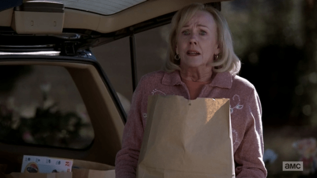 With the ricin safely in his possession once again – which begs the question, where has he been that he didn’t get the chance to snag the ricin before this? Was he in jail? On the run? Who knows? – he makes his way back to the car. Except you know how the Whites live in a suburb? Walter did, and now he finds himself face to face with a petrified blond neighbor lady holding a comically large brown bag of groceries. “Hello, Carol,” he says grimly. She drops her groceries everywhere.