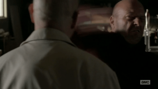 And here’s the difference between Walt and Hank is a crisis. Where Walt would probably offer some kind of clever lie or workaround to explain why there’s a tracker in the car — heck, maybe he’d even just deny it right out — Hank instead wordlessly closes the garage door behind Walt and then does this: