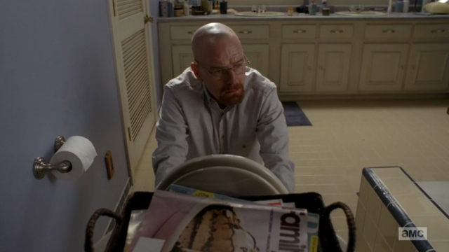 And the longest poop of Hank’s life finally ends. Well, at least, we’re presuming it’s ended, because first we have to deal with some loose ends before we jump into the rest of this season’s Breaking Bad. Gosh, I’m so excited and scared. I feel like Jessie Spano all hopped up on caffeine pills.