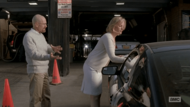 Next, an even more jarring cut to the carwash, where Walter and Skyler are both wearing crisp white/beige outfits and talking about incredibly mundane carwash stuff like what air freshener should go where, until Walter suddenly suggests that they buy another carwash. After all, they’re successful business owners now, and successful business owners expand – doing so wouldn’t just fall in line with their cover story, it would help them launder money faster. Is this how Walter has decided to allow his “empire business” machinations to manifest? Either way, Skyler seems intrigued.