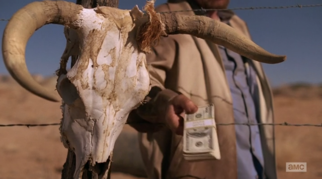 There’s an oddly jarring scene in which Walt comes across what I think might be the show’s first Native American character and asks to buy his truck. “It’s not for sale.” Of course, that doesn’t stop Walt, who holds a huge wad of cash and walks towards the camera. There’s an ominous cow skull in the foreground.