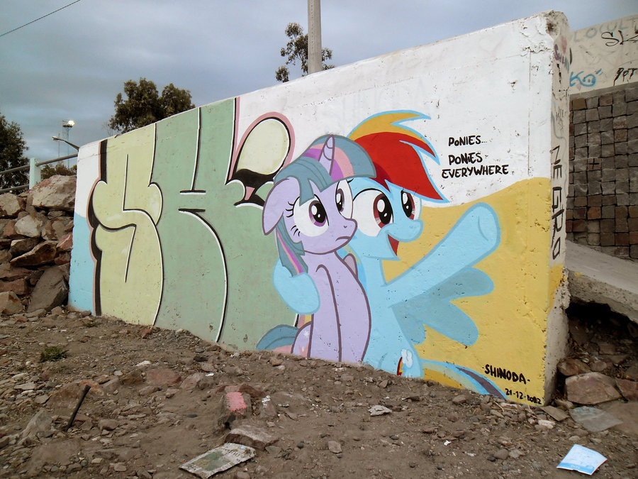 Artist Shinoda has decided Argentina needs more color. Rainbow colors to be exact. The 16-year-old recently started painting towns Brony style and needless to say, they stand out from the crowd. See which My Little Pony: Friendship is Magic characters are now gracing the streets of Argentina.