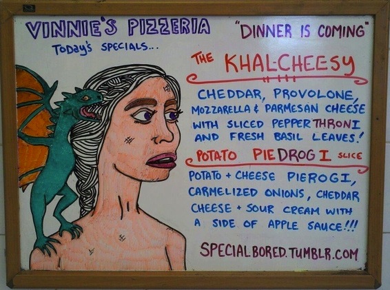 As it so happens I hold puns, pizza, and Game of Thrones very close to my heart, so my love for the Westerosi-themed specials boards at Vinnie’s Pizzeria in Brooklyn should come as no surprise. You can check out other wonderful fusions of pop culture and pizza at their Tumblr. I’m rather fond of the Aaahh!!! Real Monsters board myself.