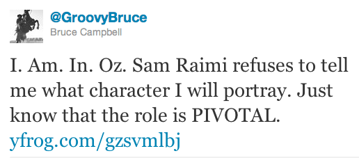 If a tree falls in the wood and no one is there to Tweet about it, does it make a sound? Just a thought. Apparently, official casting news really does happen on Twitter, because that is where cult horror icon — and Sam Raimi confidante — Bruce Campbell announced that he will be in Raimi’s upcoming Oz, the Great and Powerful. And I just realized, I will follow Bruce Campbell anywhere, including to Oz.
