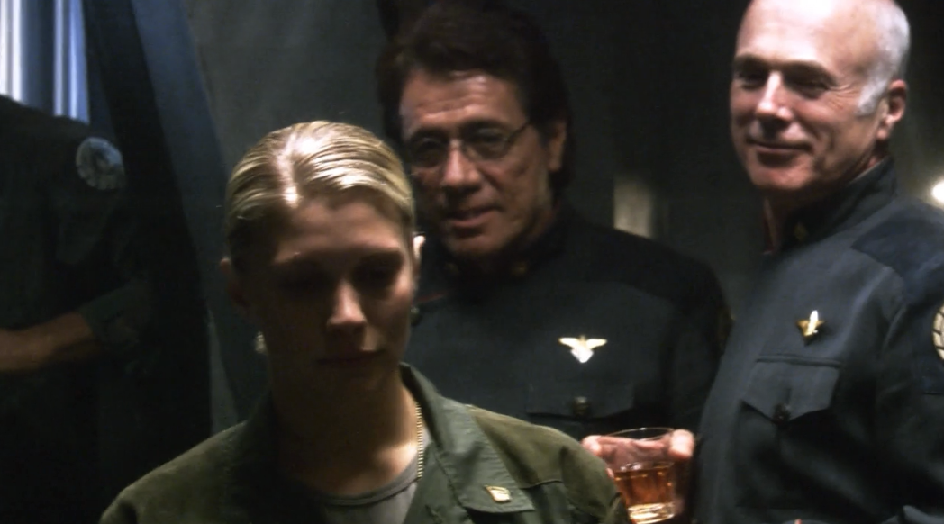 Instead Starbuck has to endure the mortification of filling Kat’s cup. Tigh’s face when she has to do that is the best thing since the last time Tigh made a hilarious face at someone else’s discomfort. (Two episodes ago, if you’re keeping track.) But Starbuck gets back at her, stealing her thunder by tearfully dedicating the celebration to their fallen pilots, whom she proceeds to list, because she actually does remember their names.