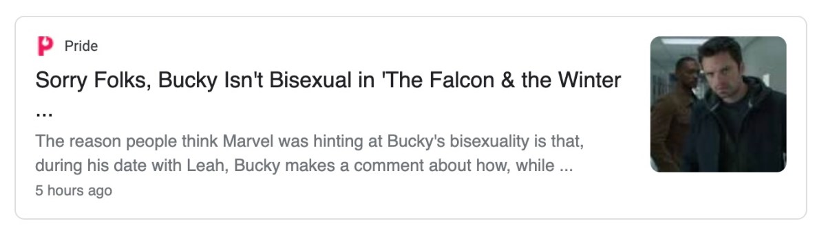 It also sets a discourse snowball in motion that quickly gathers speed. Many people don’t bother to click past a headline or gather more information beyond an outraged tweet. This has led to a sort of game of telephone awareness where now I see folks on social media claiming Marvel felt the need to directly respond on the matter of Bucky’s sexuality, as though the studio itself issued a press release about canonical heterosexuality. None of that happened.
