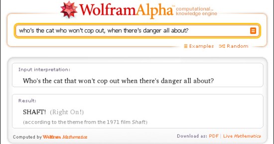 In the two years since its launch, people are still figuring what Wolfram Alpha can do. This latest revelation came from a Redditor, who discovered that Wolfram Alpha knows the words to the “Theme From Shaft” by Isaac Hayes.