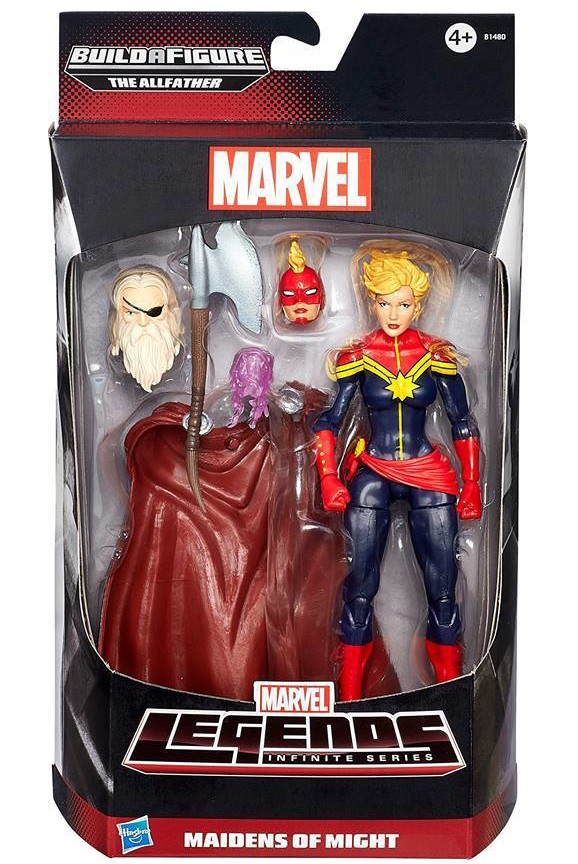 As is more or less the new “collect-em’all” style grab for Marvel Legends figures, Carol also comes with pieces of the All-father Odin. The rest of him is scattered throughout the latest line of toys, which includes Marvel NOW!’s Snortblat Thor, Scarlet Witch (both she and Captain Marvel are marketed together as “Maidens of Might”), classic purple-suited Hawkeye, Iron Fist, Sentry, and Machine Man.