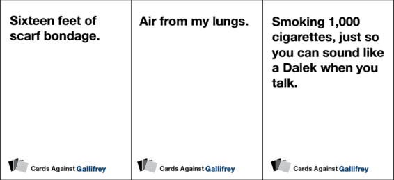 Ah, Cards Against Humanity. The best of games to play with your friends and the most uncomfortable of games to play with your family. (Christmas, two years ago. Mom and Dad, I am shocked.) And now, thanks to the comedy group Conventional Improv, there’s a Doctor Who version called Cards Against Gallifrey ready to be downloaded, printed, and added to your deck.
